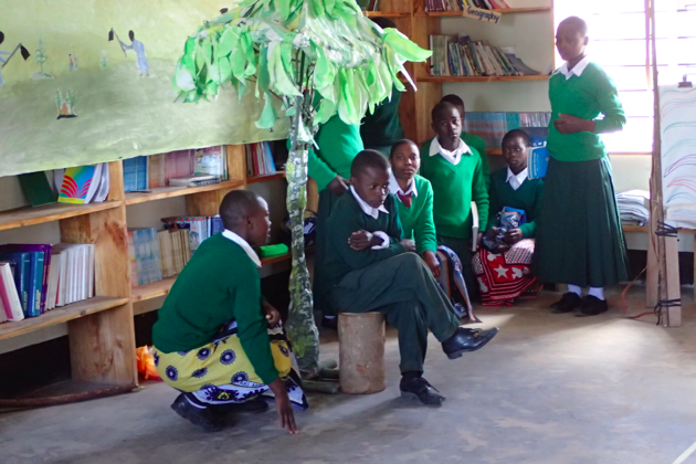 Florian Mtilega, a third year student at Teachers’ College and a recipient of an African Book Box scholarship, would expressively interpret in Kiswahili in order to ensure the students became fully involved in this new venture into drama.