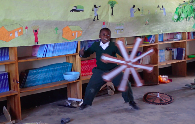 Together with the students we read in English and Kiswahili from the “big book” that Liz Priestman and I made depicting William’s story. They were mesmerized by this African story about a boy from Malawi whose creative idea and perseverance brought electricity and water to his drought stricken home and village.